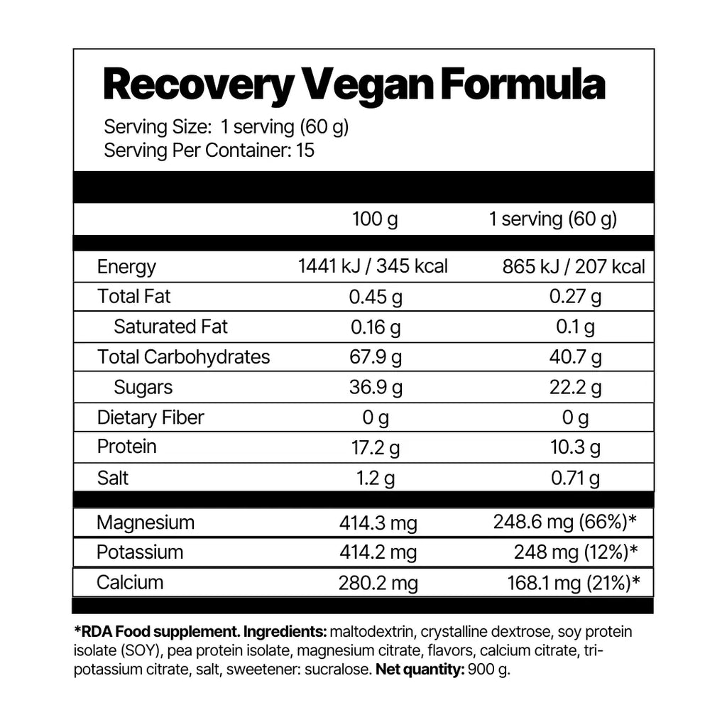 Formulated with maltodextrin, dextrose, soy protein isolate, pea protein isolate, and electrolytes, this recovery formula allows you to refill your glycogen stores, rebuild and grow your muscles, and rehydrate correctly.
